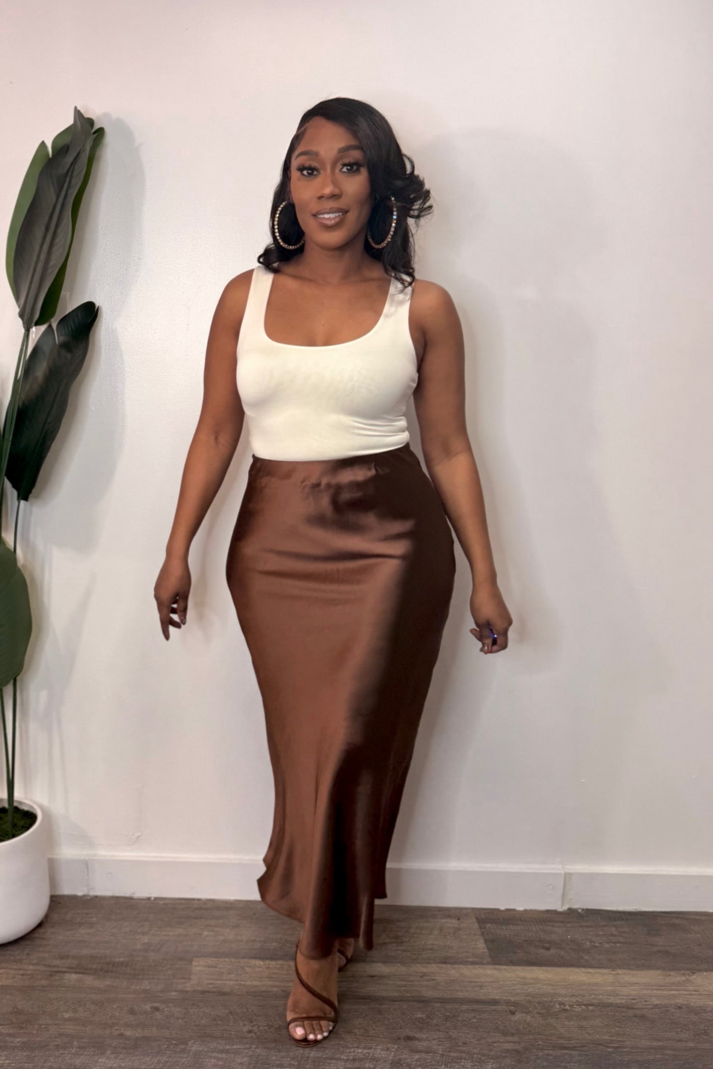 Model is wearing a Small Color: Brown Smooth satin, Sleek high-rise silhouette Comfortable fit. Elastic Waist Band 100% Polyester True to Size Full Length No Closure The cut is a timeless bias-draped maxi length. This...