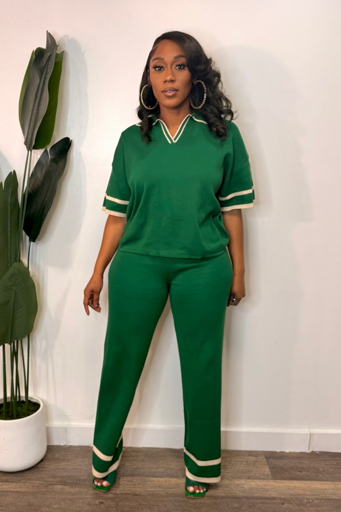 Model is wearing a Small Color: Hunter Green/Ivory V Neck Knit Stretch Factor 8/10 Fabric: 72% Viscose, 28% Polyester