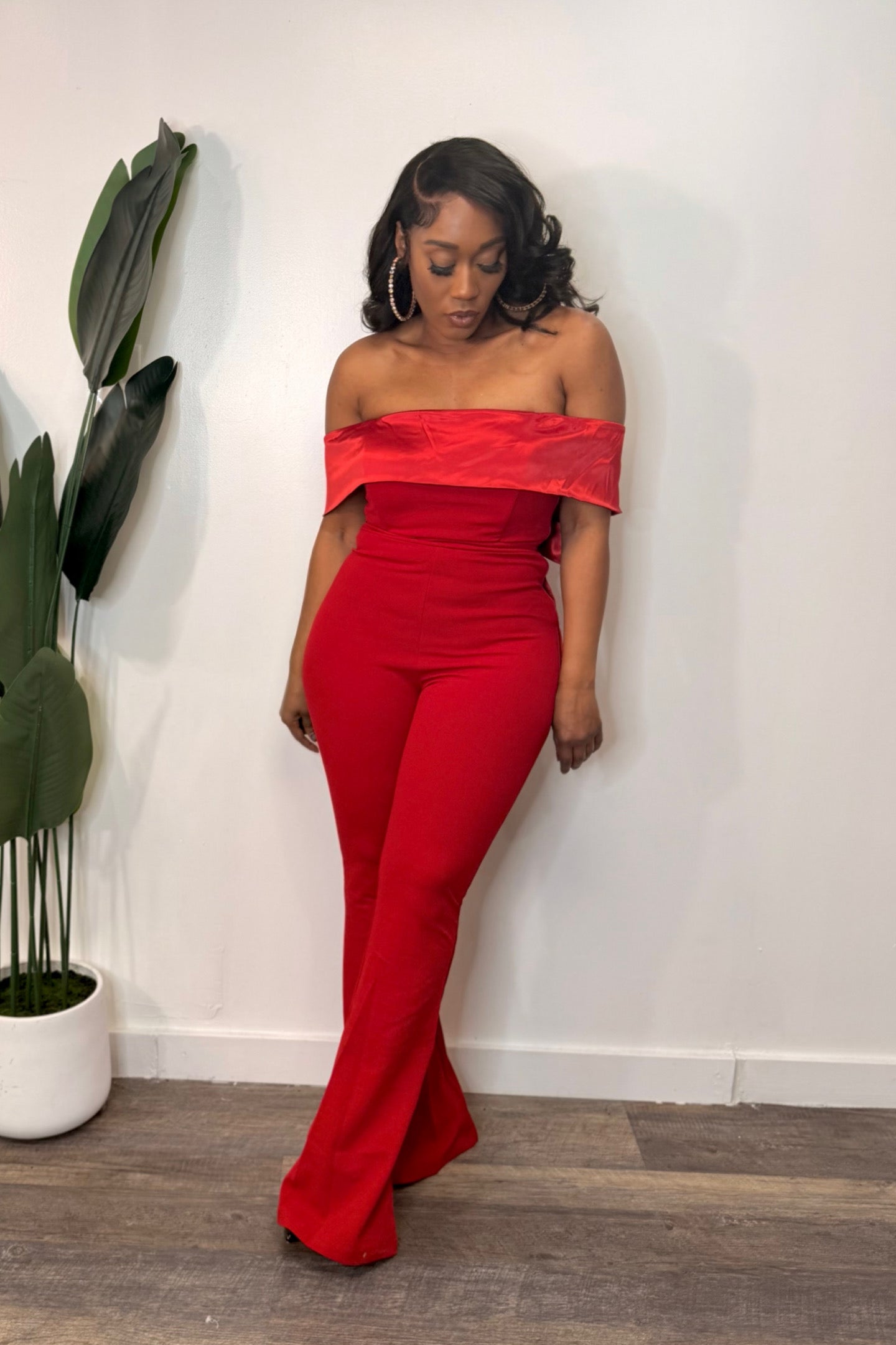 Model is wearing a Small Color: Red Satin and techno crepe contrast jumpsuit Off the shoulder High waist Large satin bow back Side zipper with hook-eye closure Bell bottom Moderate stretch Self: 95%polyester 5%spandex /...