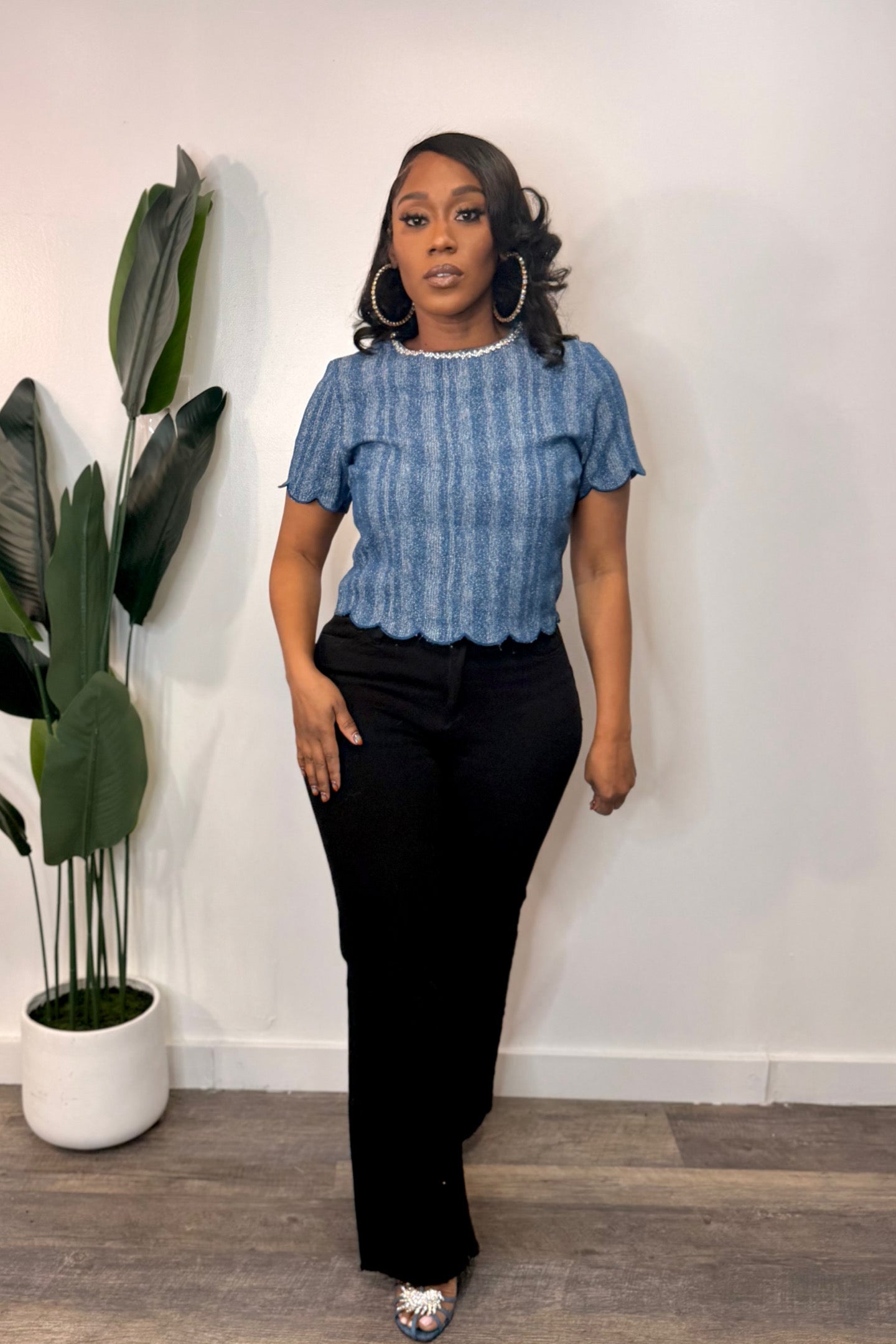 Model is wearing a Small Denim Textured Crystal embellished scalloped trim Scallop hem on sleeves and bottom of the top Back Zipper Cropped Fit