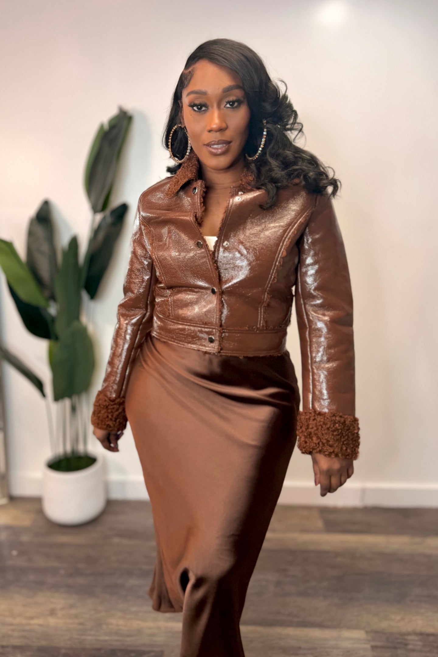 Model is wearing a Small Available In Brown. Jacket Collar Long Sleeve Faux Leather Shearling Premium shiny PU leather Silver Snap Buttons Sleek silhouette Fully Lined Elevate your style with the Sherpa Shine Moto -...