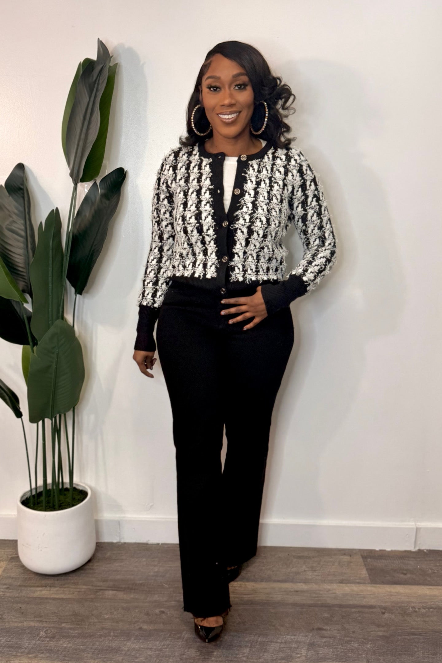 Model is wearing a Small Color: Black & White Knit Cardigan with Contrast Houndstooth Textured Soft Button Closure Knit Collarless Long sleeves 45% Viscose 40% Polyester 15% Nylon Dress up or down this double...