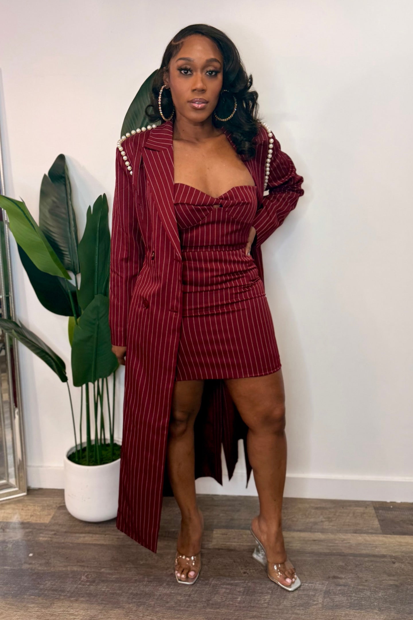 Model is wearing a Medium Color: Burgundy Pinstripe Three-piece set Tailored longline coat, matching cropped top, and coordinating mini skirt. The long coat features a structured silhouette Sharp lapels and elegant pearl shoulder detailing, Fitted...