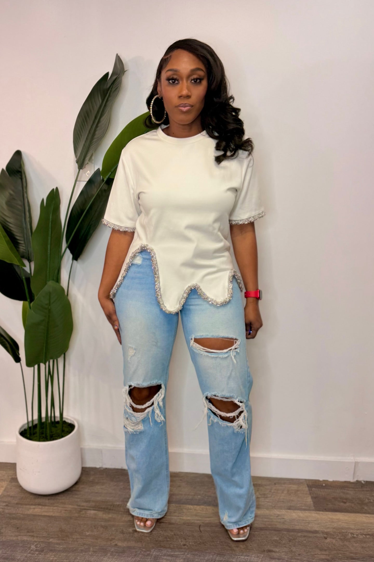 Model is wearing a Small White and Crystal Wavy Hem Oversized Tee 65% POLYESTER 30% COTTON 5% SPANDEX A relaxed yet elevated essential. This white oversized tee features a soft wavy hem accented with subtle...