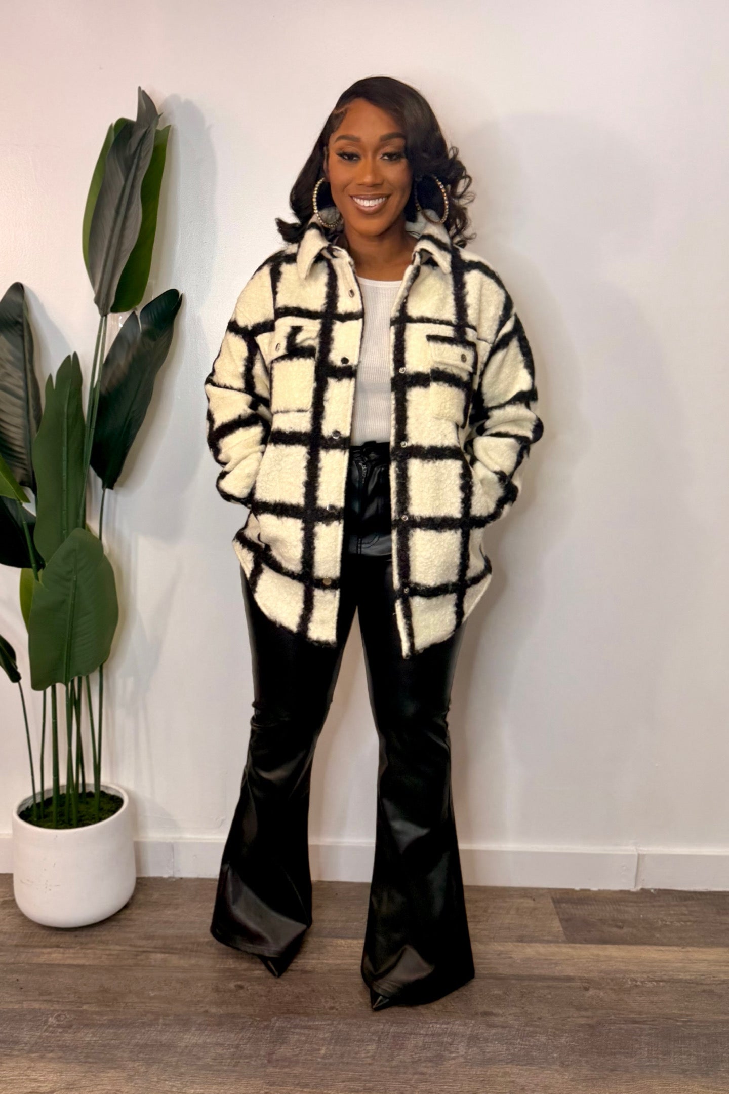 Model is wearing a Small Model Wearing Size Small Color: Black, Ivory Brushed Fleece Material Grid Lines Pattern Long Sleeves Collared Neckline Button-Up Front Four Front Pocket Details Material Has No Stretch 20" Armpit To...