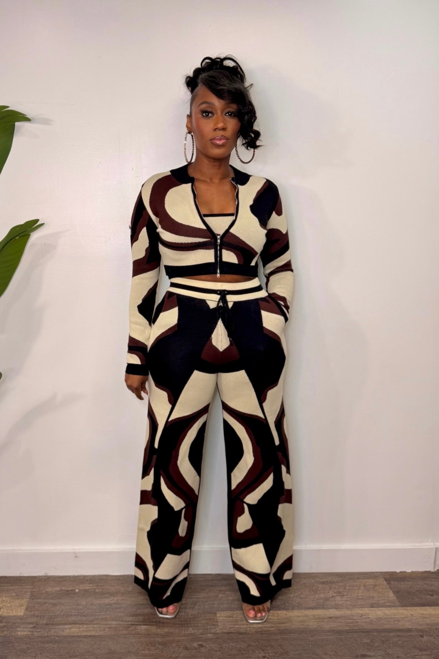 Model is wearing a Small Chocolate Abstract Set 3-pieces High-quality Bandeau Top with Gold Button Detail Long Sleeve Crop Jacket with 2-Way Zipper High Waist Trouser with Thick Elastic Waistband Side Pockets Material: Thick Knit...