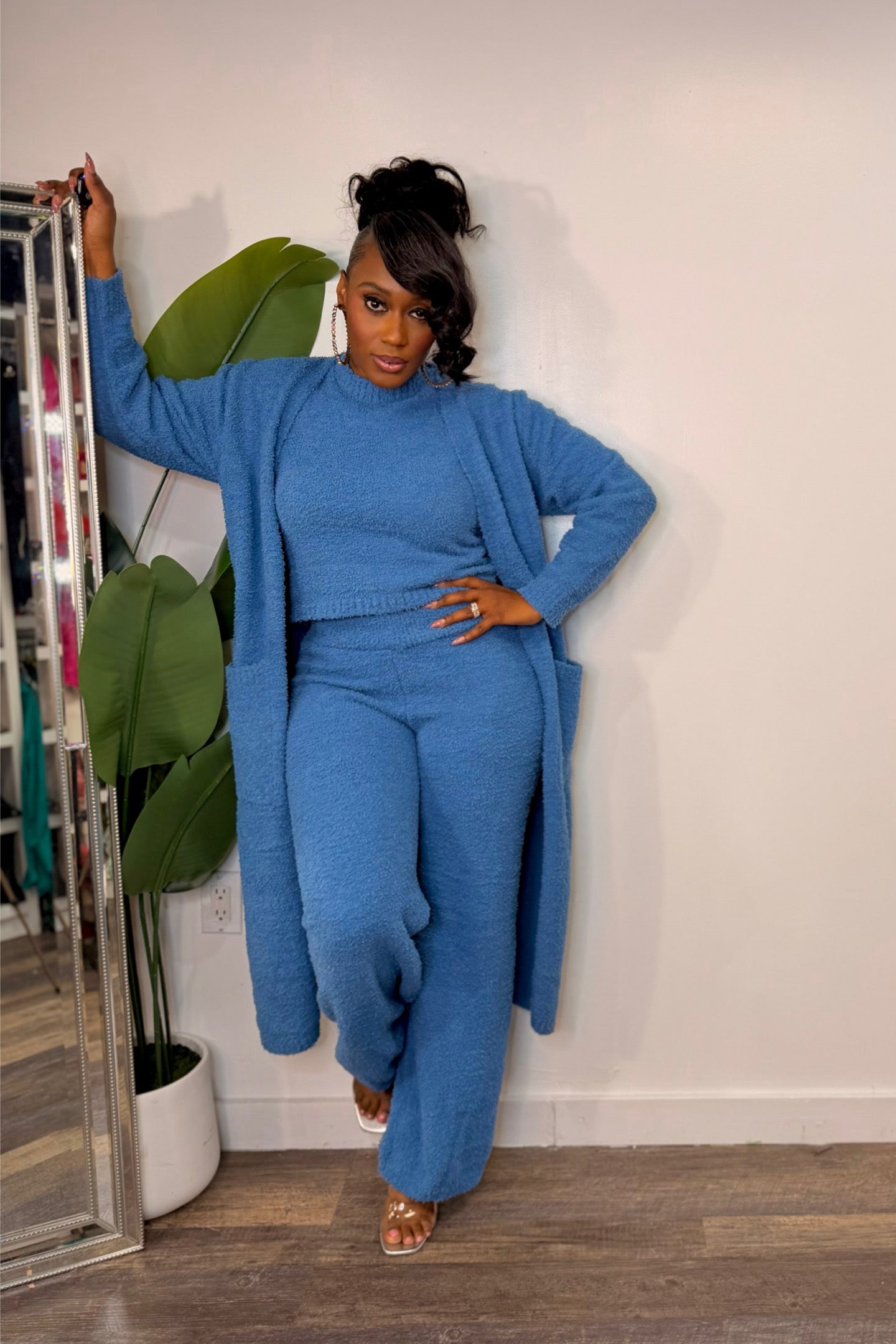 Model is wearing a Small Color: Blue 3 Piece Full length pants Sleeveless Waist length top Long open cardigan Front pockets Cardigan side slits