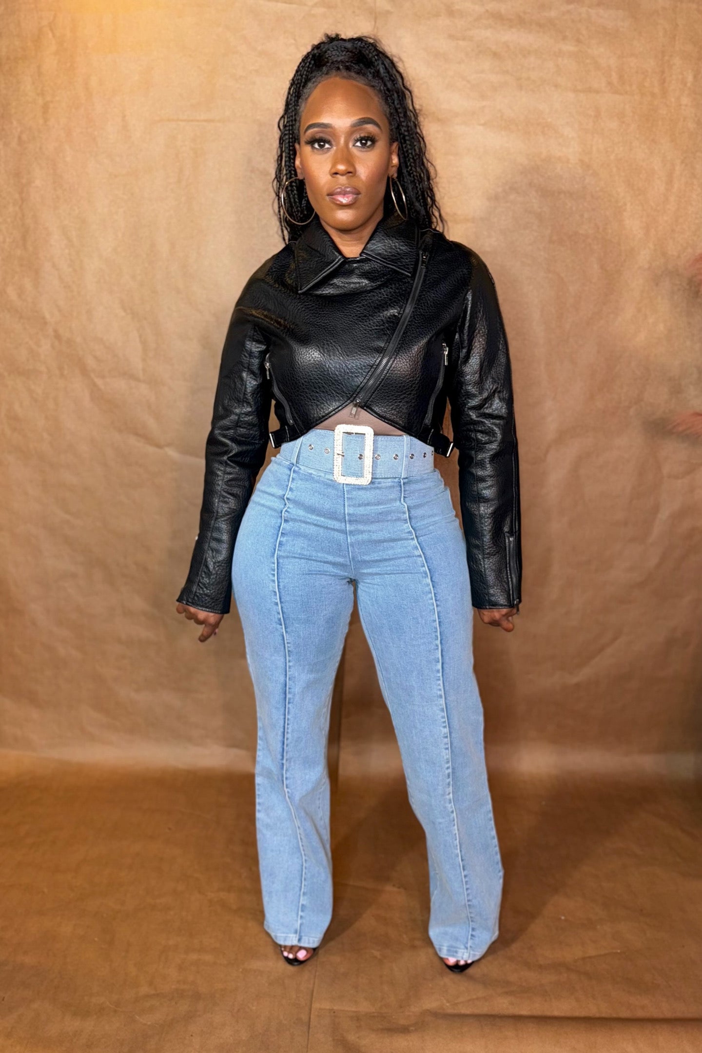 * Matches well with our denim, blue puff sleeve tie top or our both suede hooded denim jacket